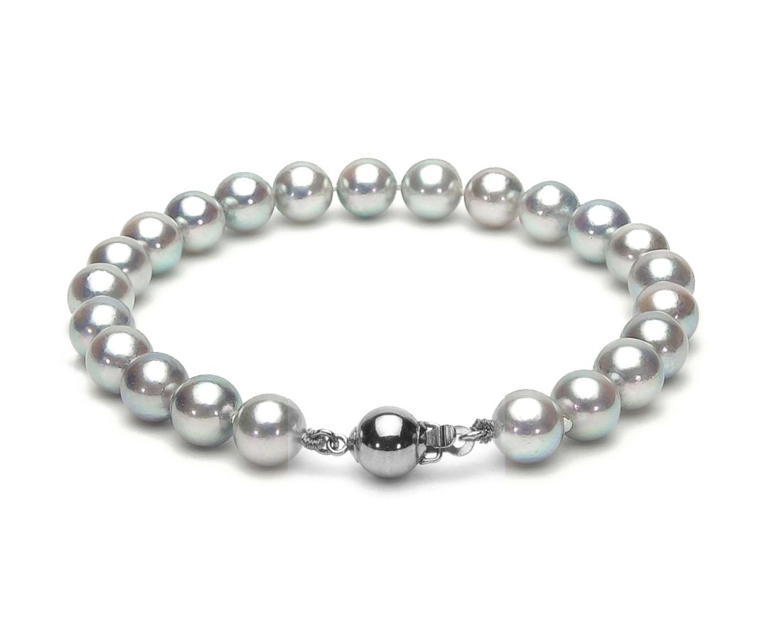 Elegancka bransoleta z pięknych pereł Akoya z kulistym zapięciem z białego złota. Duże, okrągłe perły morskie o unikalnej srebrzystej barwie, subtelnym błękitno-różowym overtonie i wspaniałym połysku. Biżuteria znakomita na co dzień jak również do wieczorowych kreacji.