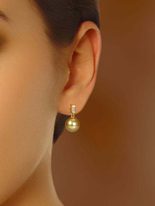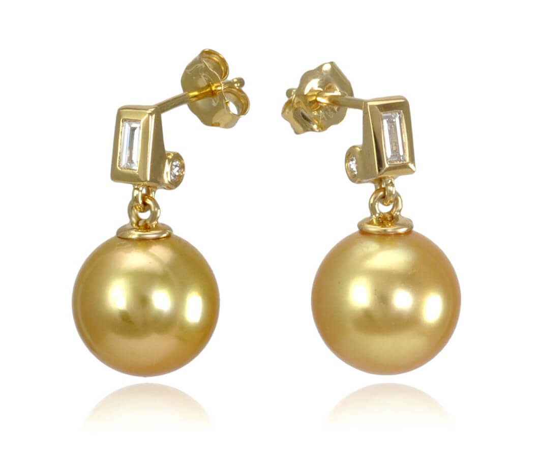 Eleganckie złote kolczyki z perłami o prostej, klasycznej formie. Jedne z najbardziej pożądanych kamieni - perły Mórz Południowych o tak poszukiwanej złotej barwie, nieskazitelnie gładkiej powierzchni i wspaniałym blasku. Minimalistyczna oprawa z żółtego złota zdobiona diamentami o formie bagiety.